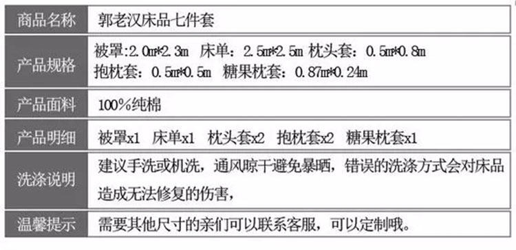 大七件套:大四件套(单面老粗布被罩)×1,抱枕套×2,糖果枕套×1